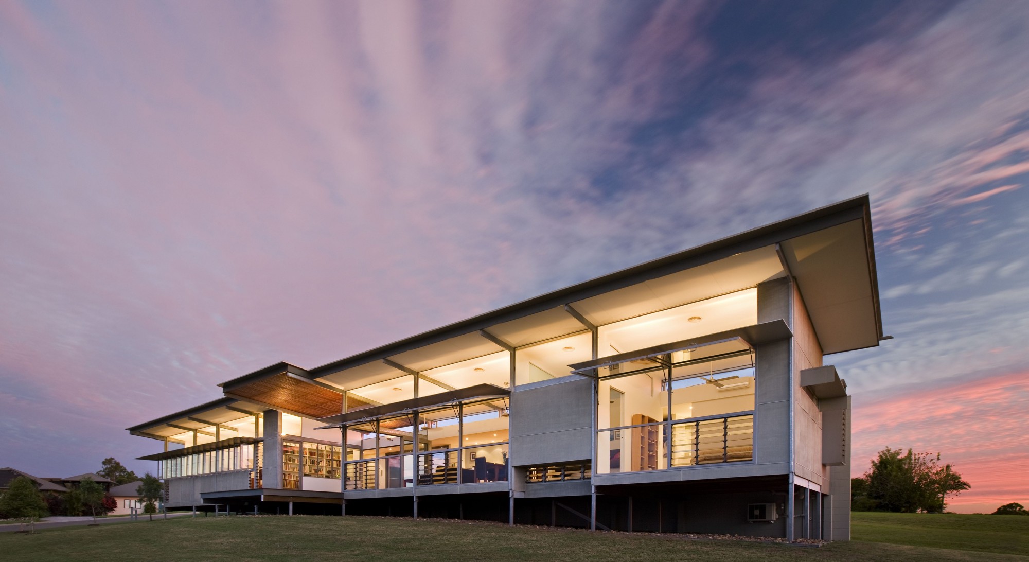 Much of the movement in Hervey Bay house is along its continuous ‘garden wall’, which anchors the structure to the site. This garden wall also provides its residents privacy and form for two lightweight glazed pavilions. Across the house are a series of galvanised steel portal frames which express a legibility of structure and adds a lightness that contrasts with the solid masonry.