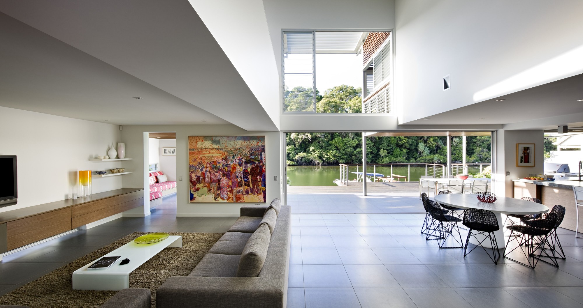 The outdoor living areas make seamless and ambiguous connections with the interior spaces, which enhance a sense of place living on the river. The framed views across the river to the lush green Noosa landscape are gorgeous. Clean white planes with the warmth of natural timber frame the contemporary backdrop for fine furniture, art and relaxed river living.