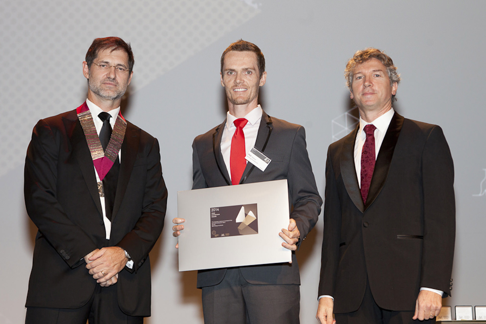 Images – On stage, Bark Design Architects Associate, Phil Tillotson (middle), Richard Kirk, AIA Queensland Chapter President (left), Liam Proberts, AIA State Jury Director (right),