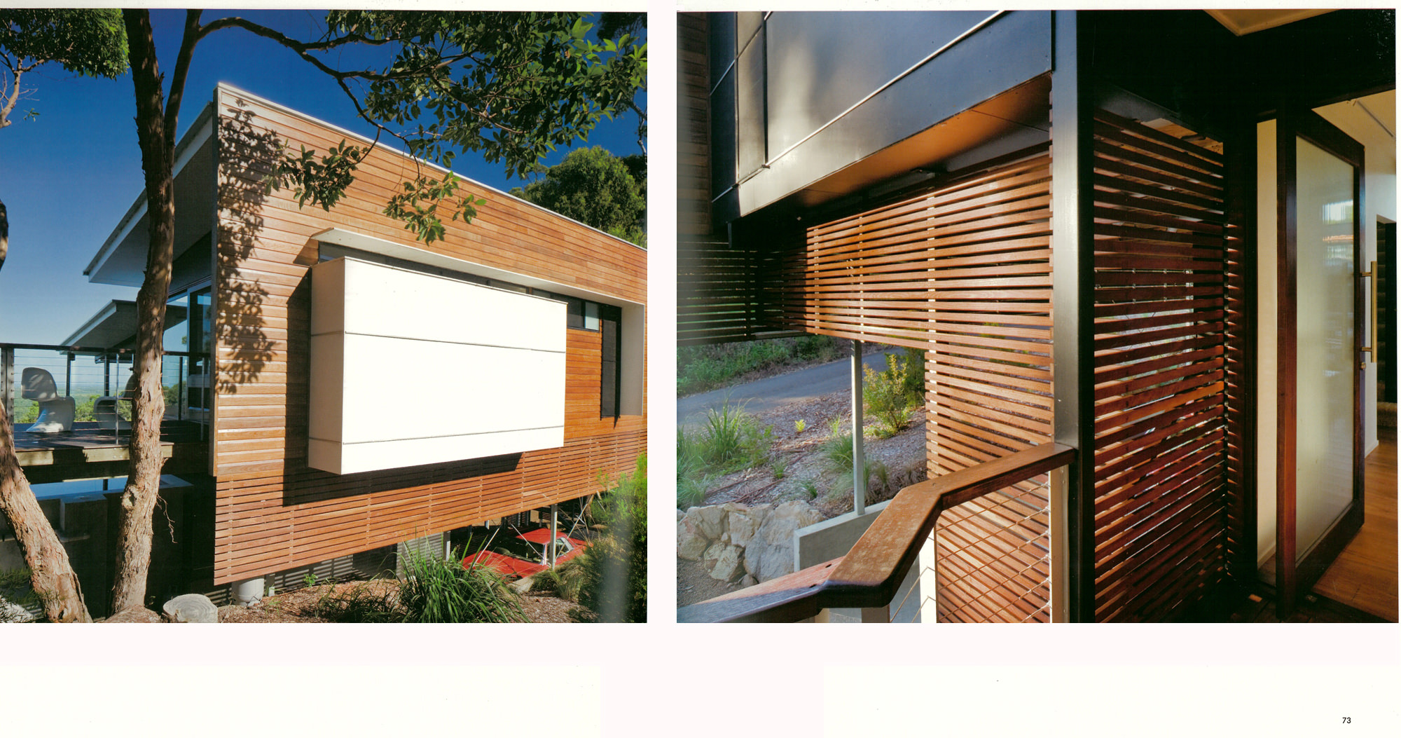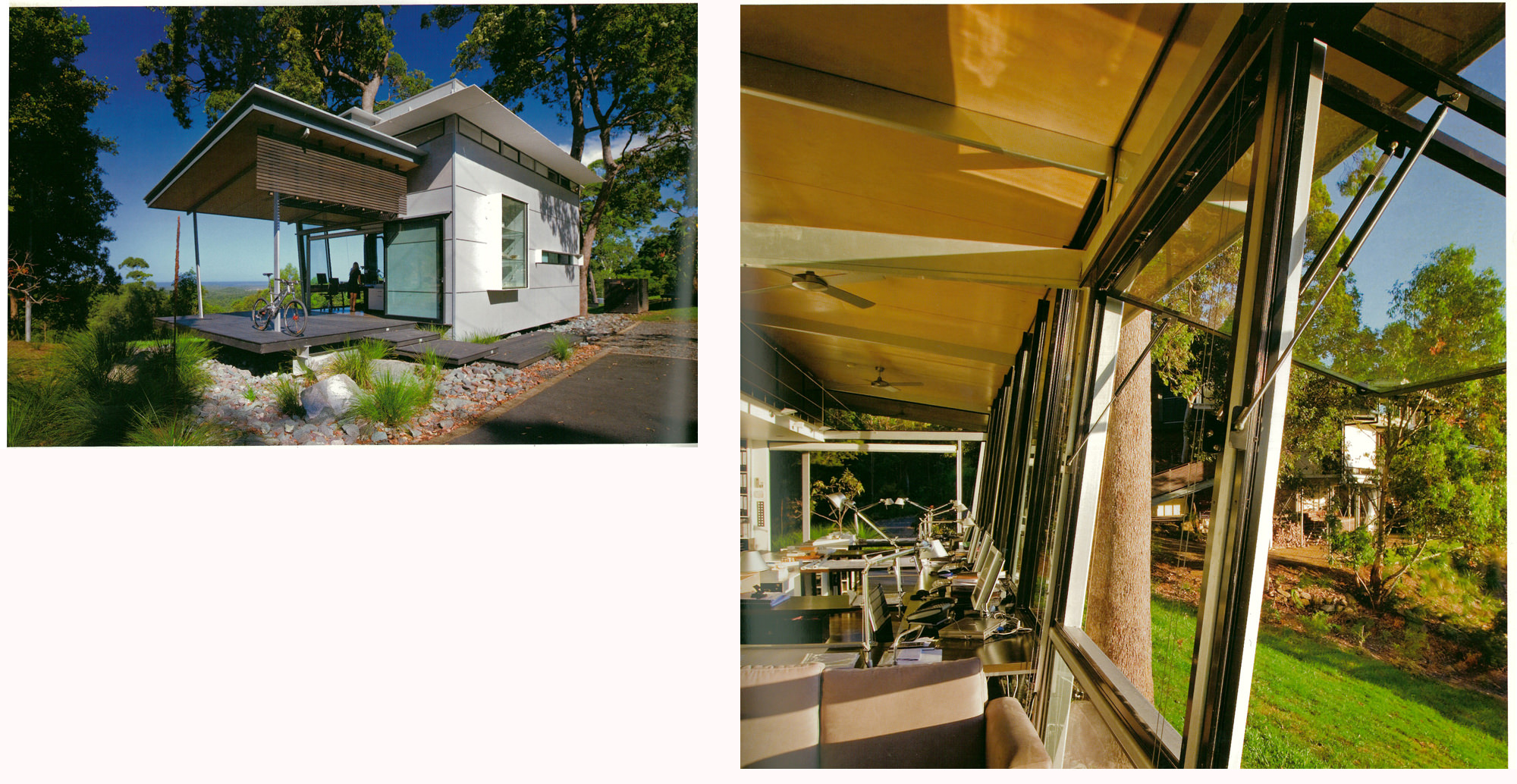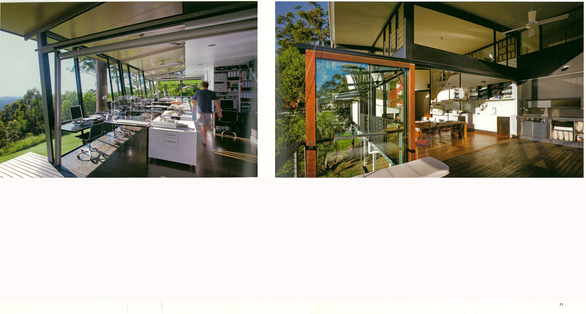 Looking deceptively small, the studio includes a full workspace for the architect’s entire office. On the adjacent property, Bark designed not only the house, but also a detached work pavilion to match the apparently relaxed idiom of the residence. But a view from the other side shows a complex composition which recalls the intensity of the constructivist detailing which the 1920’s modern applies to small buildings.