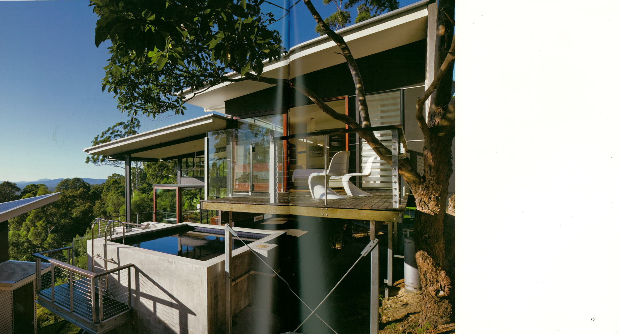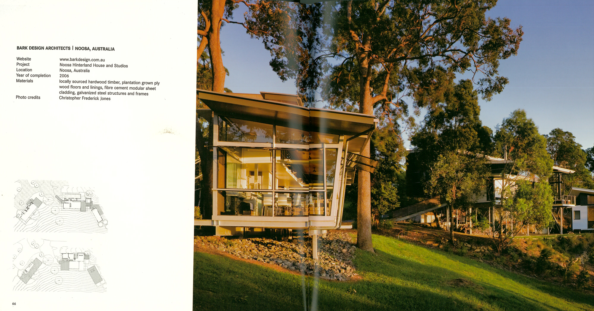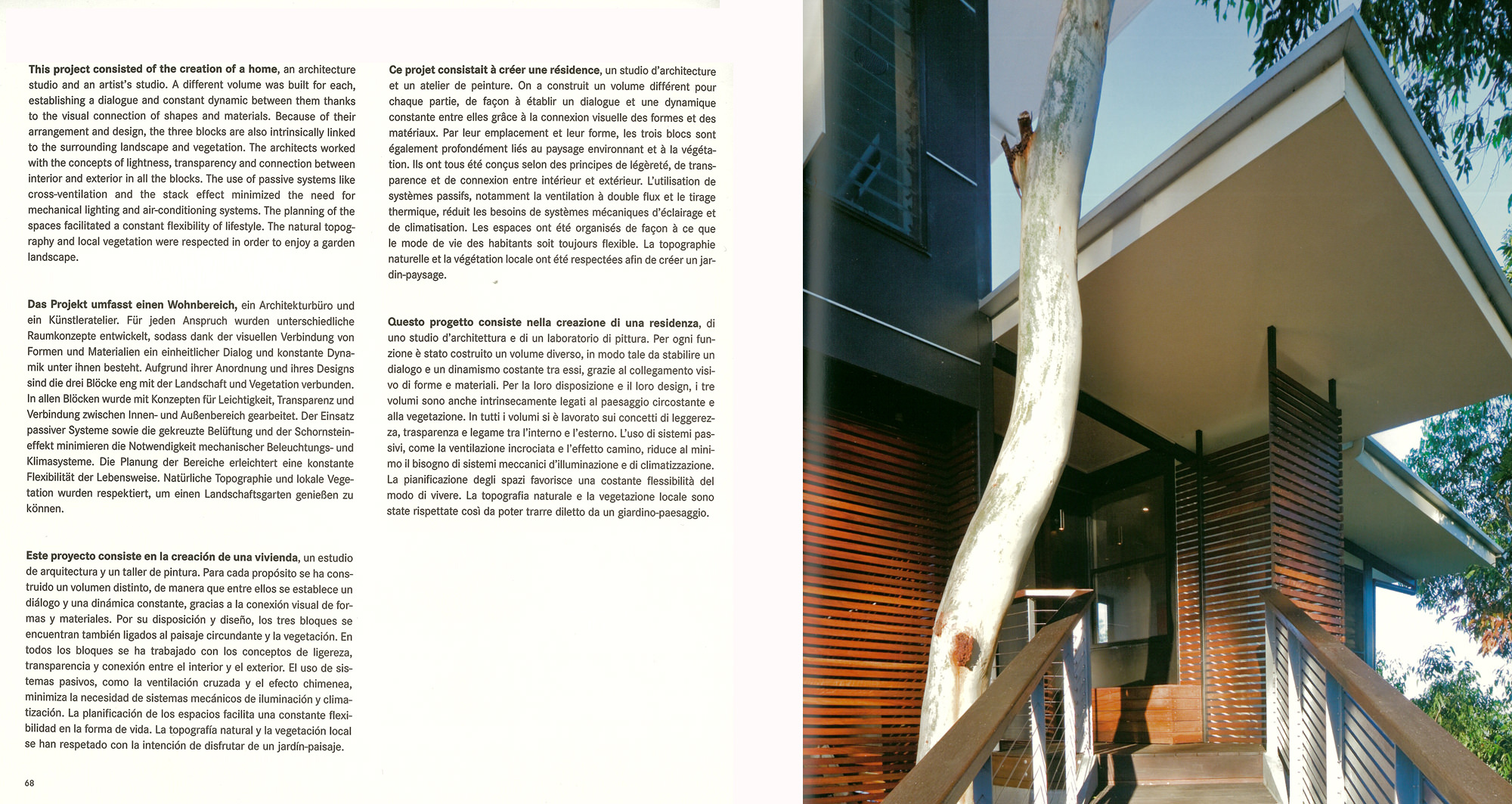 Looking deceptively small, the studio includes a full workspace for the architect’s entire office. On the adjacent property, Bark designed not only the house, but also a detached work pavilion to match the apparently relaxed idiom of the residence. But a view from the other side shows a complex composition which recalls the intensity of the constructivist detailing which the 1920’s modern applies to small buildings.