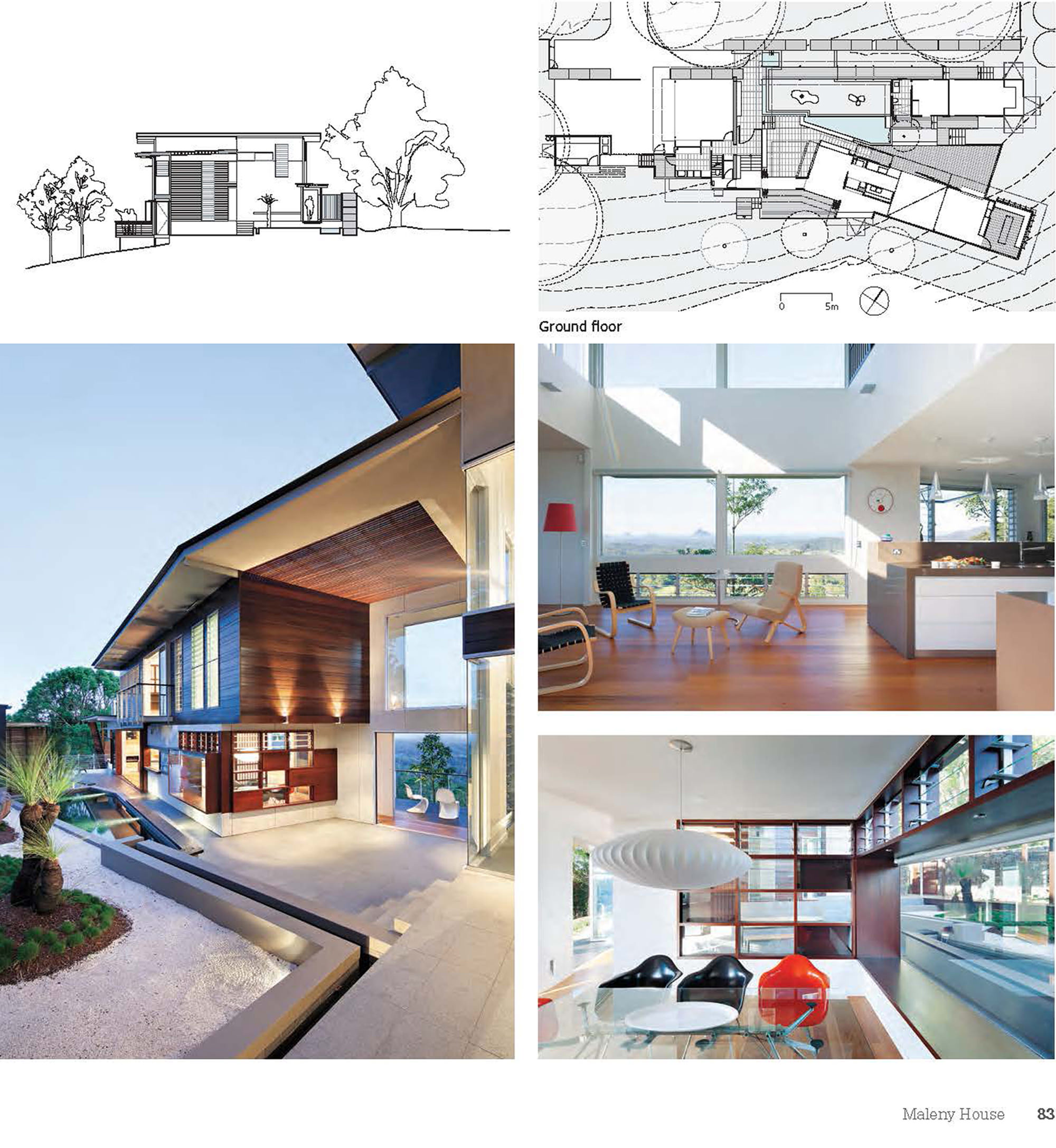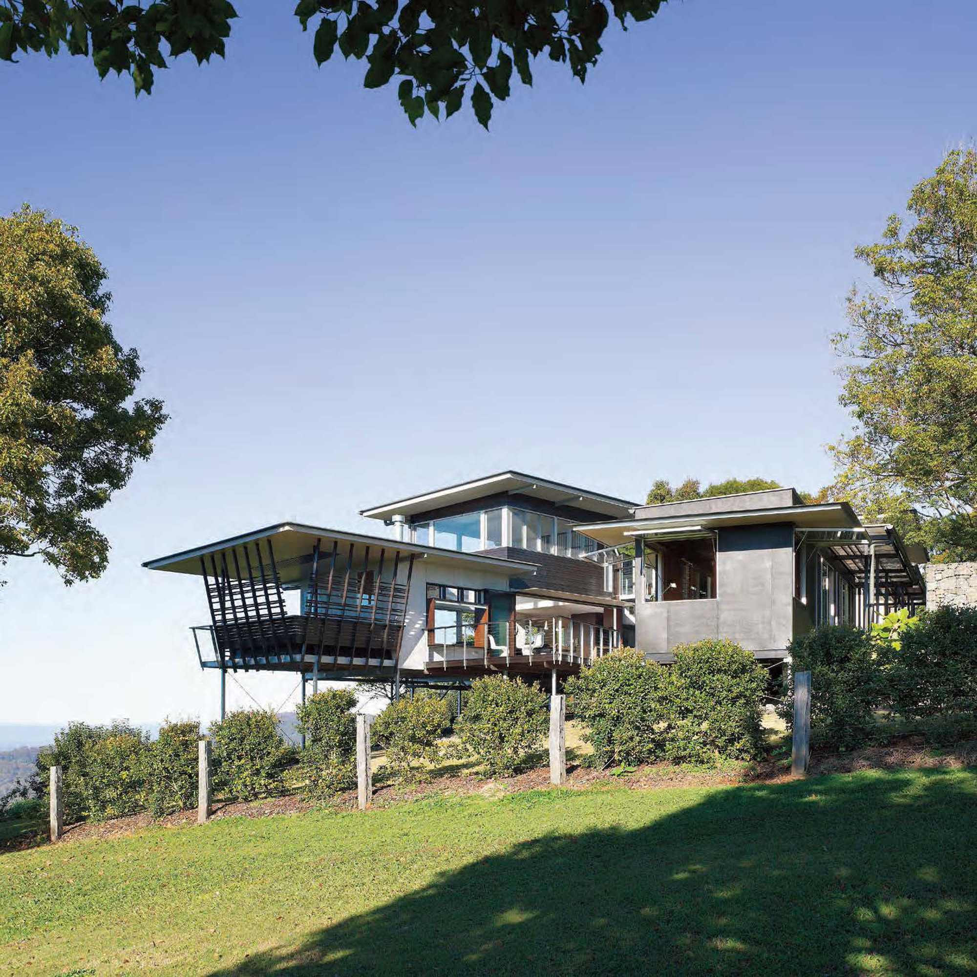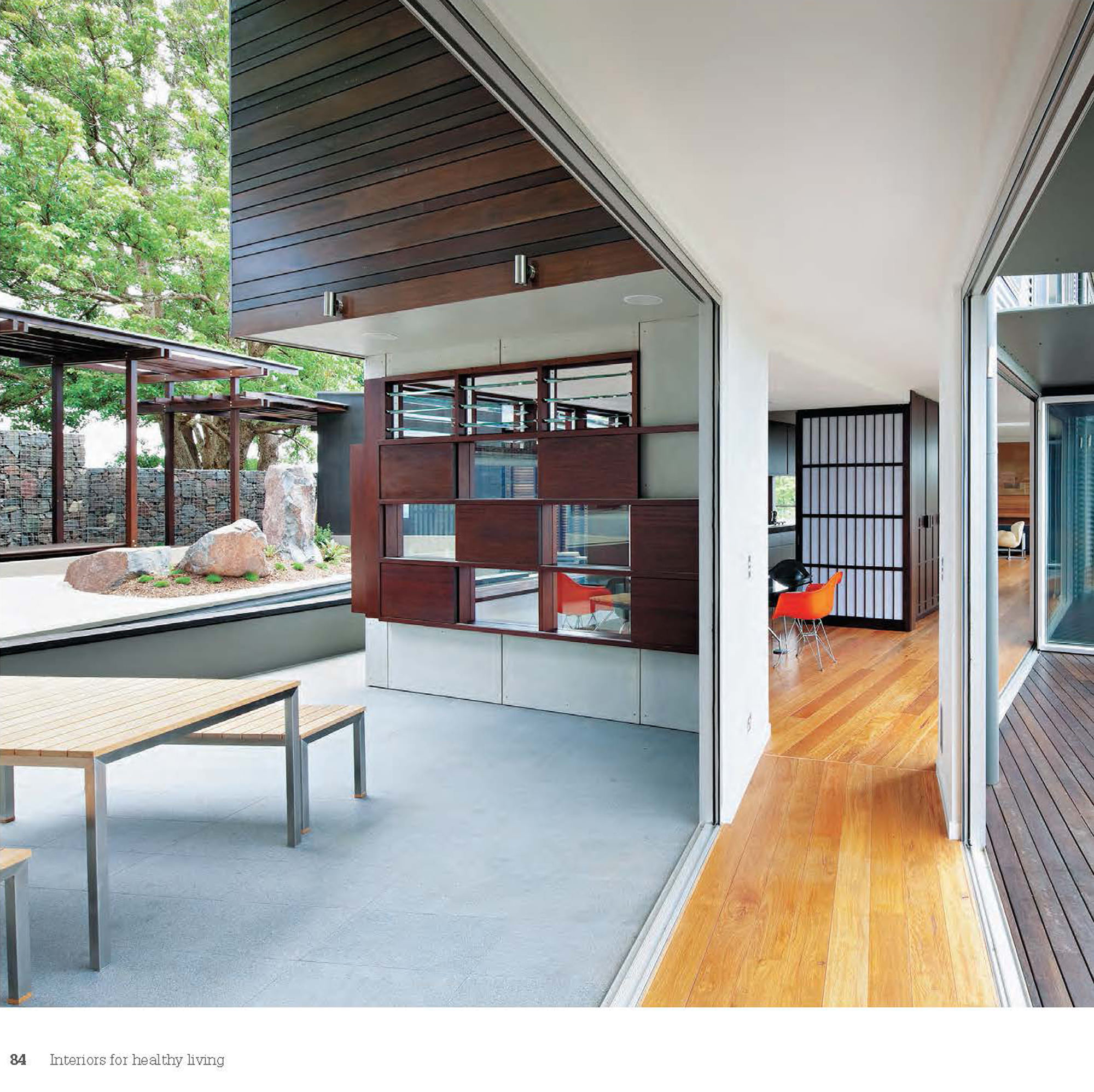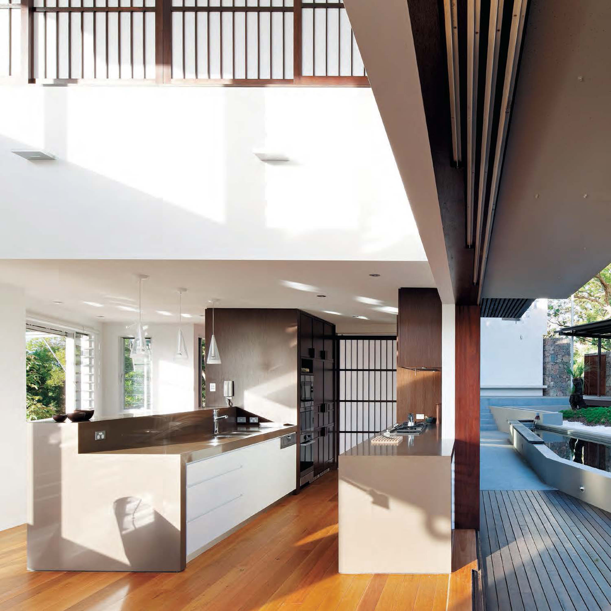 Engaging with its site’s topography, orientation, views and vegetation, the interior practises the Japanese philosophy of wabi-sabi – “the beauty of things imperfect, impermanent and incomplete, allowed to weather and evolve over time”.