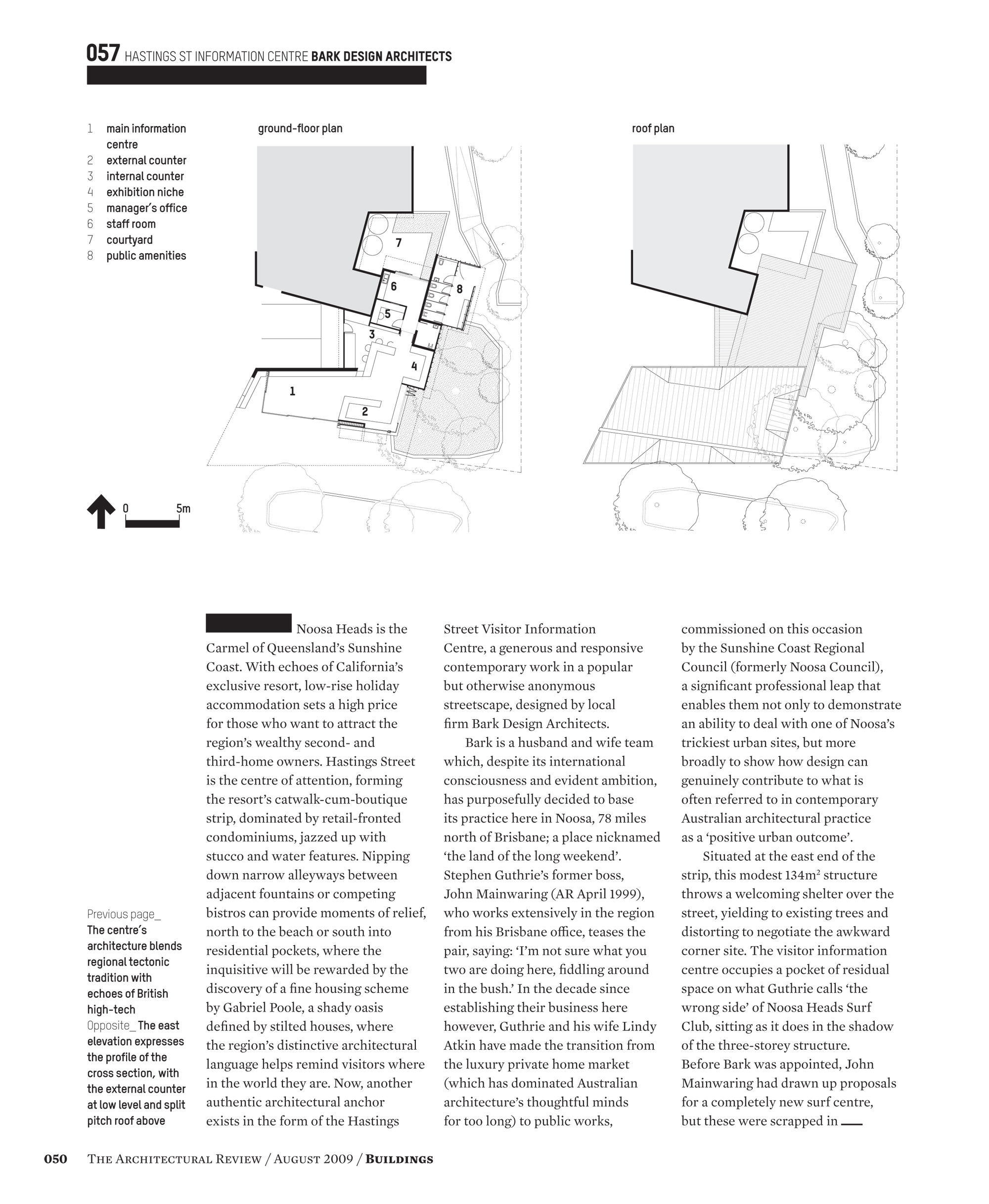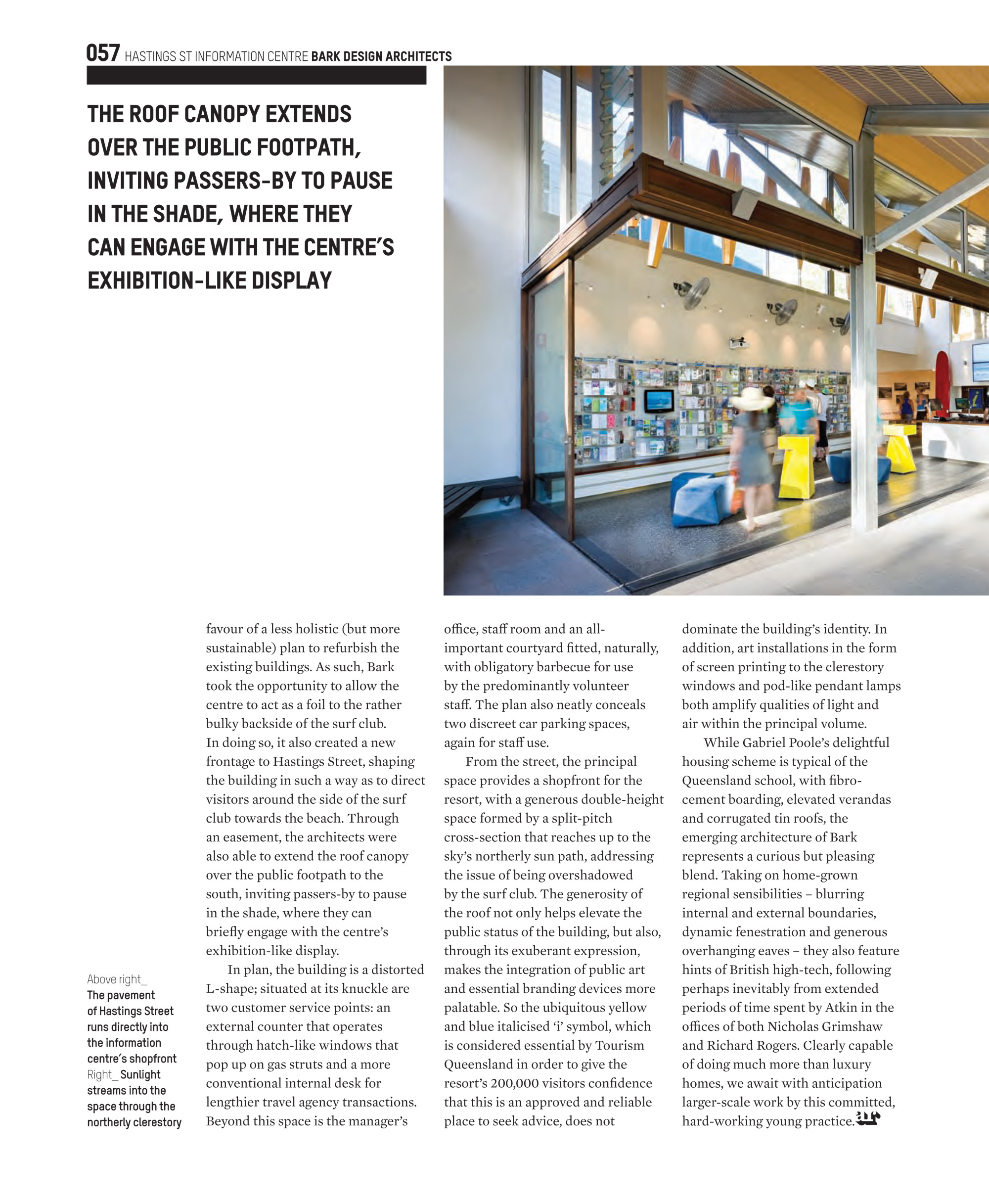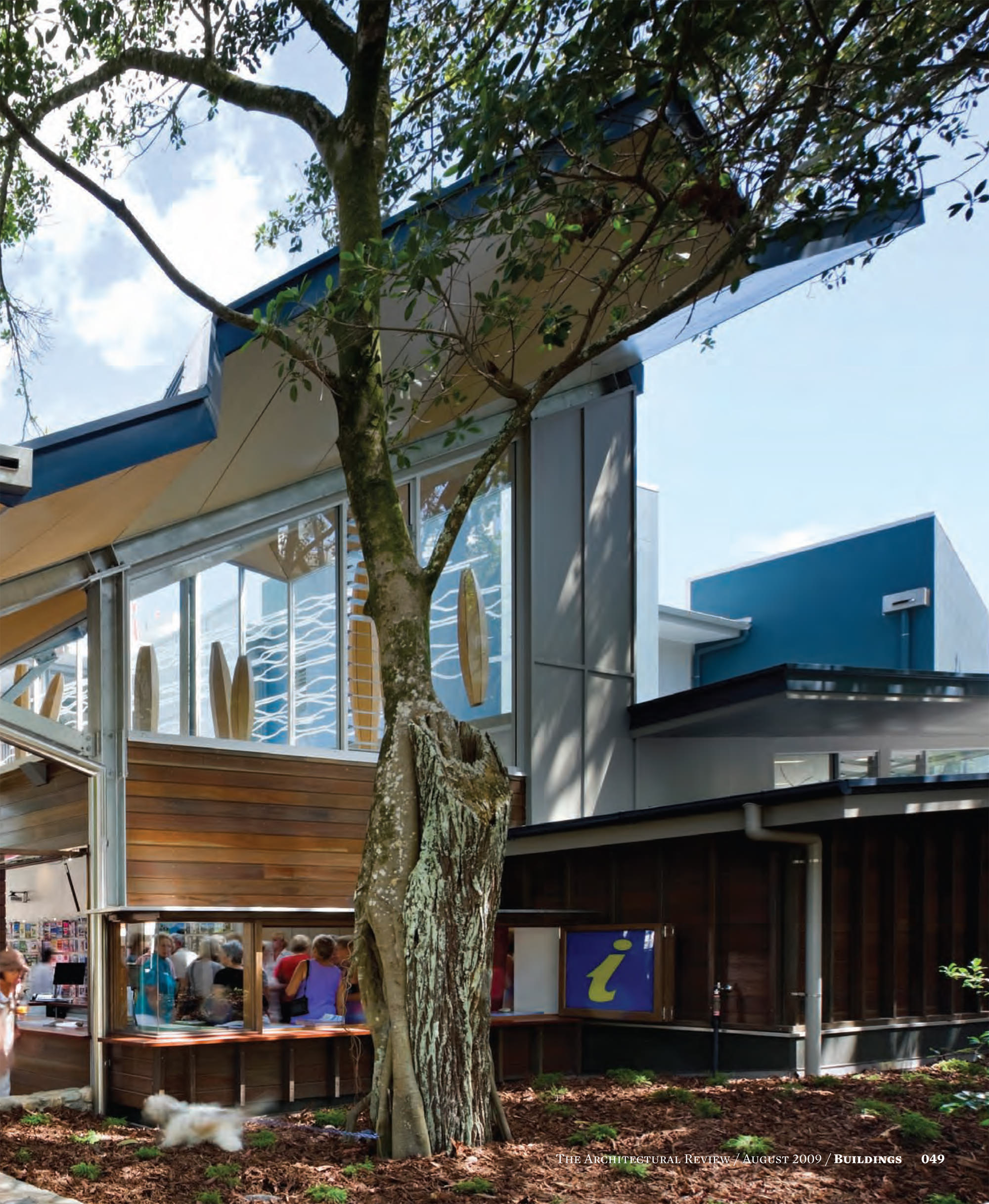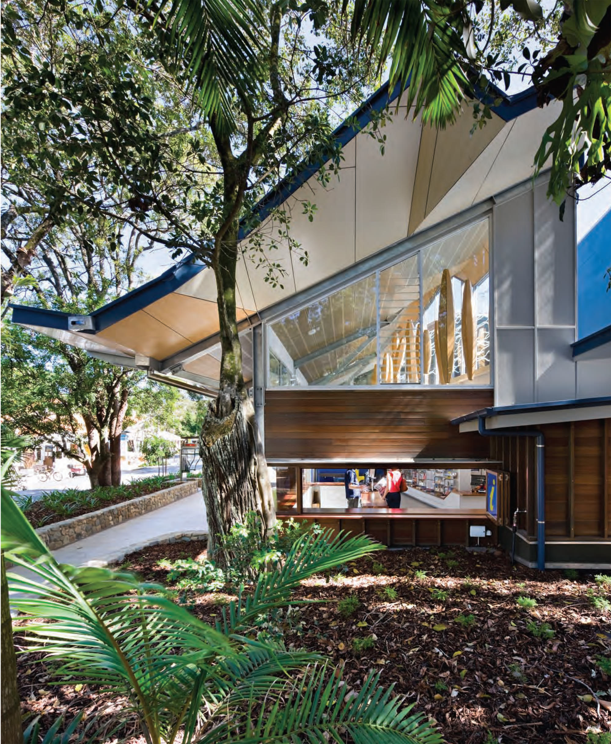 Noosa’s distinct architectural language has been further enhanced by the generous and responsive design of Noosa’s Visitor Information Centre located on Hastings Street, Noosa. The roof canopy extends over the footpath inviting passers-by to pause in the shade and engage.