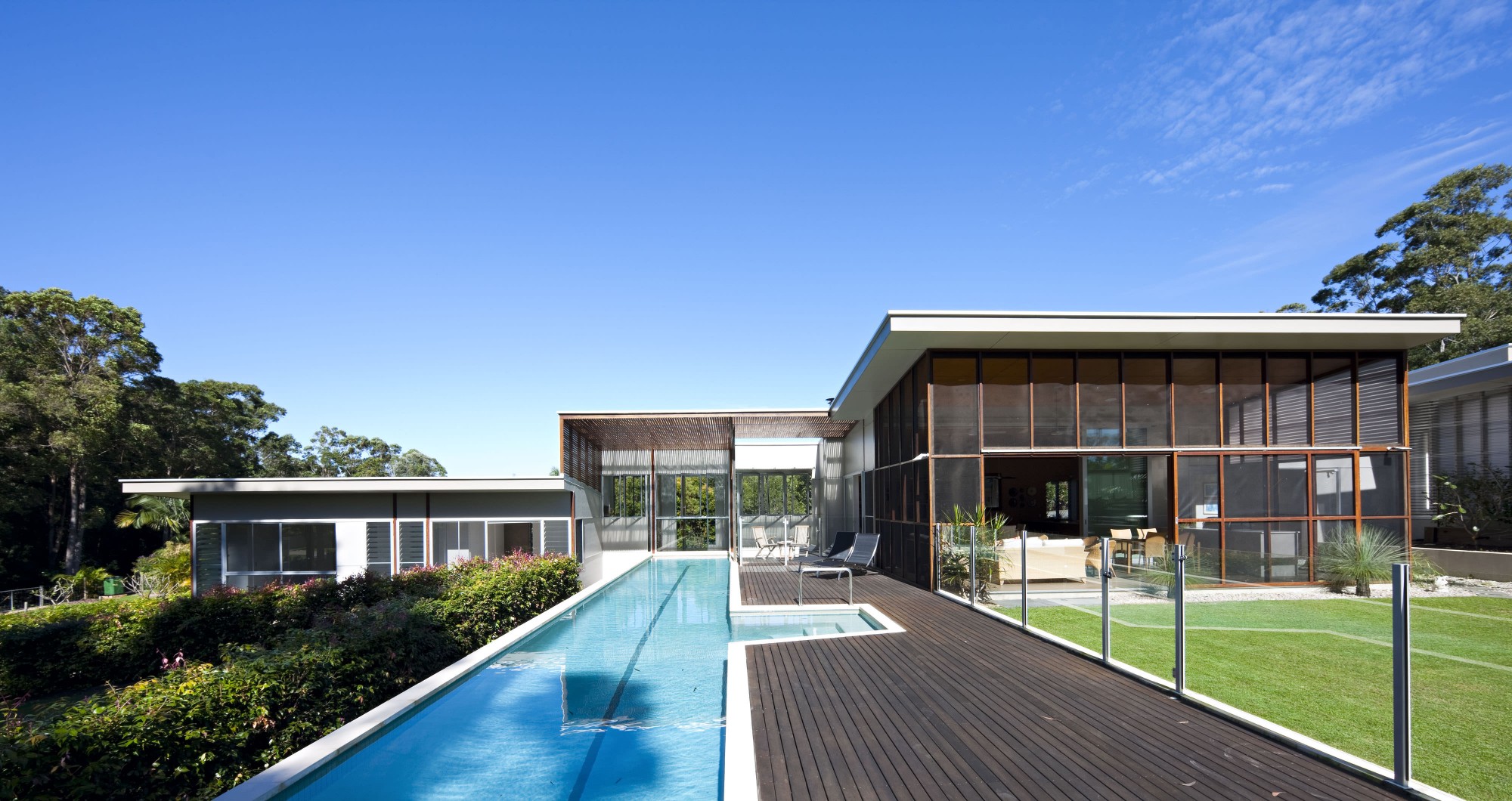 Completed in 2008, the Noosa Valley Pool House was inspired by the construction of mid-to-last century timber and fibro fishing shacks and little mobile homes affectionately known as wedgies scattered along the coast. Drawing on the local vernacular of fibro, bleached timber and concrete with the subtle influence of a Bali-style compound, our aim was to create an oasis within the property’s walls. The main attraction of this property is its courtyard feature, which is shaped like a ‘u’ around the house. The house has a garden at its centre, surrounded by internal spaces and a lap pool that can be seen from virtually every part of the house making up its perimeter. For privacy and economical reasons, the property is shielded from the street by a block wall. Taking the focus off the exterior of the house meant that more of the budget could be utilised creating interesting volumes within the space – for example the main double-height space inside. Concentrating on how the space worked from within was always our priority.