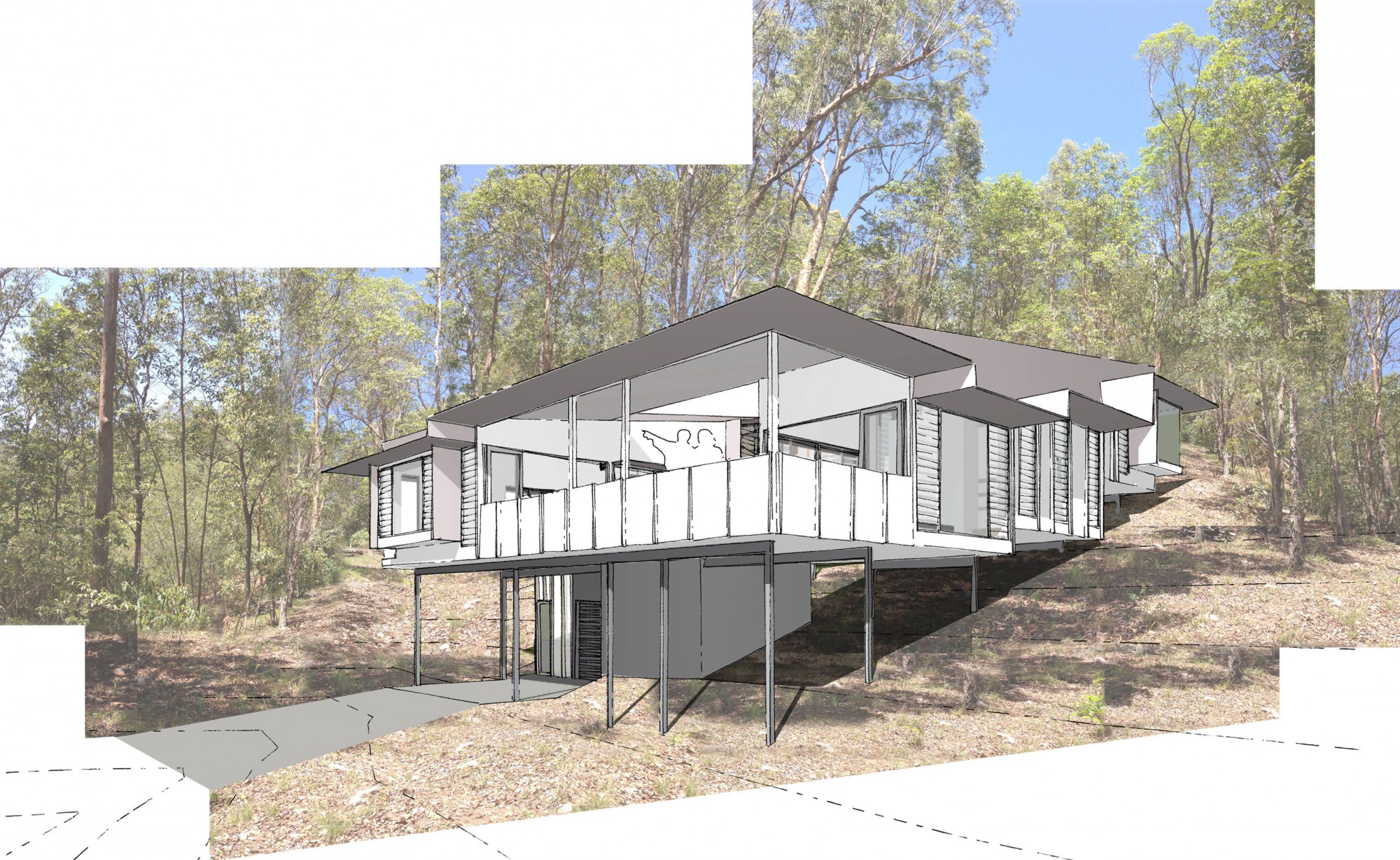 This house was designed on a steep and challenging 7000m² bush site in The Gap in Brisbane, taking into consideration various council overlays including biodiversity, bushfire, landslide and critical infrastructure & movement planning. Our brief was to design the perfect home of lightweight construction, ensuring that it had a minimal impact on the site and a practical floor plan above the ranging terrain. The living and bedroom spaces wrap around a mature Jacaranda tree which is featured as purple is the favourite colour of the clients. This tree alongside the central courtyard and adjoining pool make up the heart of the house, tucked away from the wild surroundings in a private sanctuary within the property. Above fulfilling all the functional aspirations of this design brief, The Gap House has been designed to capture and celebrate its gorgeous surrounding natural landscape by highlighting what is outside and bringing it into the space.